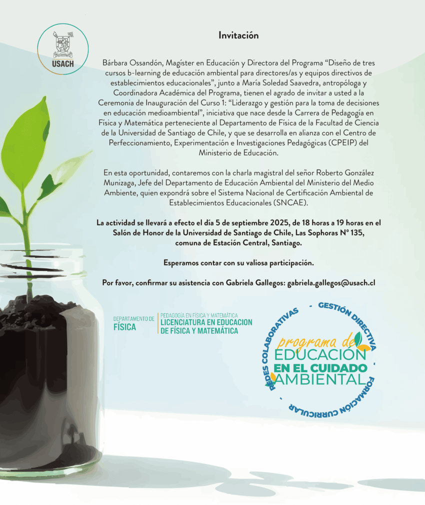 Se invita a la comunidad a la Ceremonia de Inauguración del Curso 1: "Liderazgo y gestión para la toma de decisiones en educación medioambiental", iniciativa que nace desde la carrera de Pedagogía en Física y Matemática perteneciente al Departamento de Física de la Facultad de Ciencia de la Universidad de Santiago de Chile, y que se desarrolla en alianza con el Centro de Perfeccionamiento, Experimentación e Investigaciones Pedagógicas (CPEIP) del Ministerio de Educación.